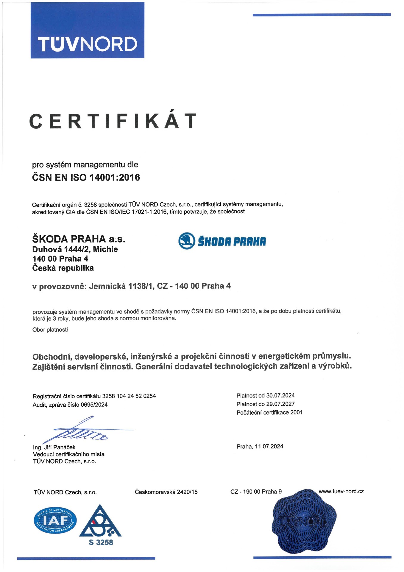 ŠKODA PRAHA vytvořila, dokumentuje, uplatňuje, udržuje a neustále zlepšuje integrovaný systém řízení v souladu s požadavky na kvalitu dle normy EN ISO 9001:2015, ochranu životního prostředí dle normy EN ISO 14001:2015 a na bezpečnost a ochranu zdraví při práci dle ISO 45001:2018.